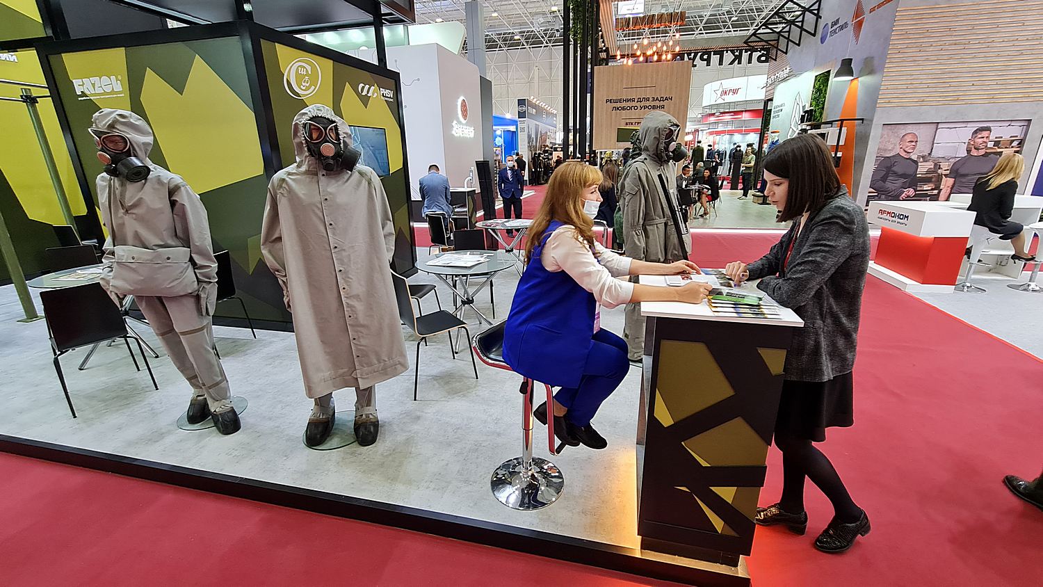 изделия индивидуальной защиты кожи – общевойсковые защитные костюмы изолирующего и фильтрующего типов, а также форменный камуфлированный костюм и образец нового общевойскового фильтрующего защитного комплекта (ЗАО швейная фабрика «Славянская»).